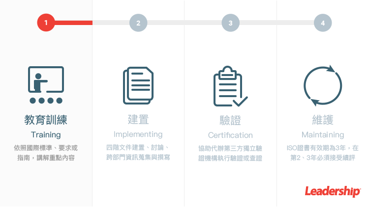 領導力企管提供ISO認證或各式國際標準客製化最佳解決方案與服務項目,第1:提供教育訓練(Training)、第2:建置(Implementing)、 第3:驗證(Certification)、第4:維護(Maintaining)共計4大服務項目。協助有效率的建立各式國際標準系統,例如 ISO 9001:2015 品質管理系統。最終產出符合規定的程序書、紀錄等相關文件,順利通過第三方驗證機構認證,取得符合國際公信力的國際標準證書。 您可以依據需求,選擇所需的服務項目,歡迎來電 0800-222-007 / Email: service@isoleader.com.tw或 線上留言,將有專人與您聯繫。