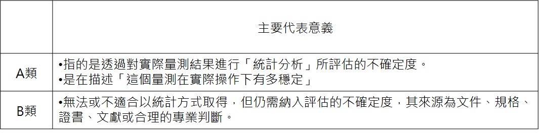 A 類與 B 類的差異,在於不確定度的「評估方式」,而不是不確定度的「大小」或「等級」。