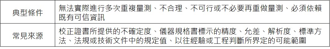 B 類不確定度是來自你「沒有辦法用統計方式重新取得,但仍然必須納入的不確定資訊」。
