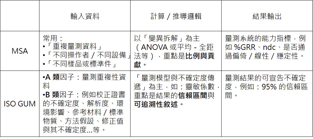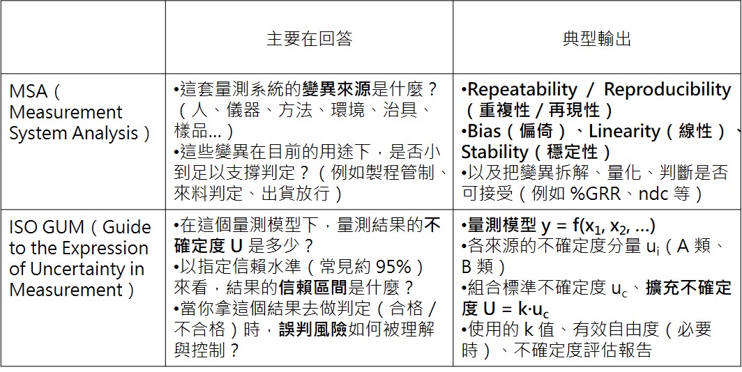 先用 MSA 確認量測系統的變異是可控的(不然後面都是空談),再用 GUM 把可控後仍存在的誤差,用不確定度形式呈現(讓結果能被採信)。