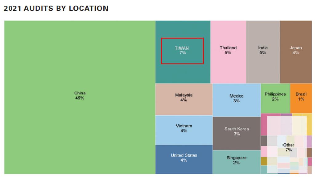 全球 RBA VAP 稽核總數佔比,台灣雖然僅佔了 7%,但仍是為世界第二,足以窺見台灣在電子供應鏈之舉足輕重。