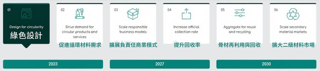 許多 RBA 成員反映希望將循環供應鏈納入 RBA 範疇,以其能夠降低其碳足跡並幫助他們實現永續發展策略略,但因為供應鏈提供的透明度不足,回收材料存在重大風險。RBA 將考慮了會員提出的建議行動,預計將循環材料 (回收材料) 納入循環電子產業供應鏈要求中,並致力倡議 CEP (Ciculor Electronics Partnership) 的 2030 電子業循環材料策略路徑圖 (如下圖),並鼓勵民間企業制定進入循環經濟路徑圖之策略行動。循環材料現行之常見認證如 GRS、ISCC、RCS,亦可供企業依照產業類型與市場需求選擇適合之認證,及早佈局。