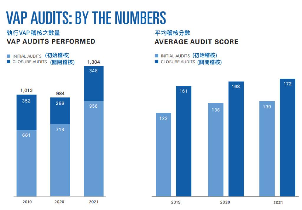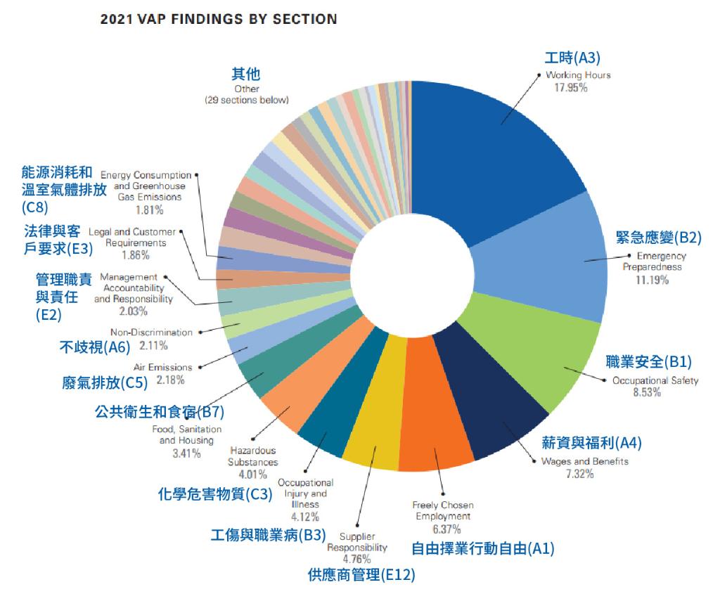 2021 年度 VAP 稽核前 10 大第一名與 2020 年相同,仍是工時 (A3*),其次依序為:緊急應變 (B2)、職業安全 (B1)、工資(A4)、自由擇業行動自由 (A1)、供應商管理 (E12)、工傷與職業病(B3)、化學危害物質 (C3)、公共衛生和食宿 (B7)、廢氣排放 (C5)。