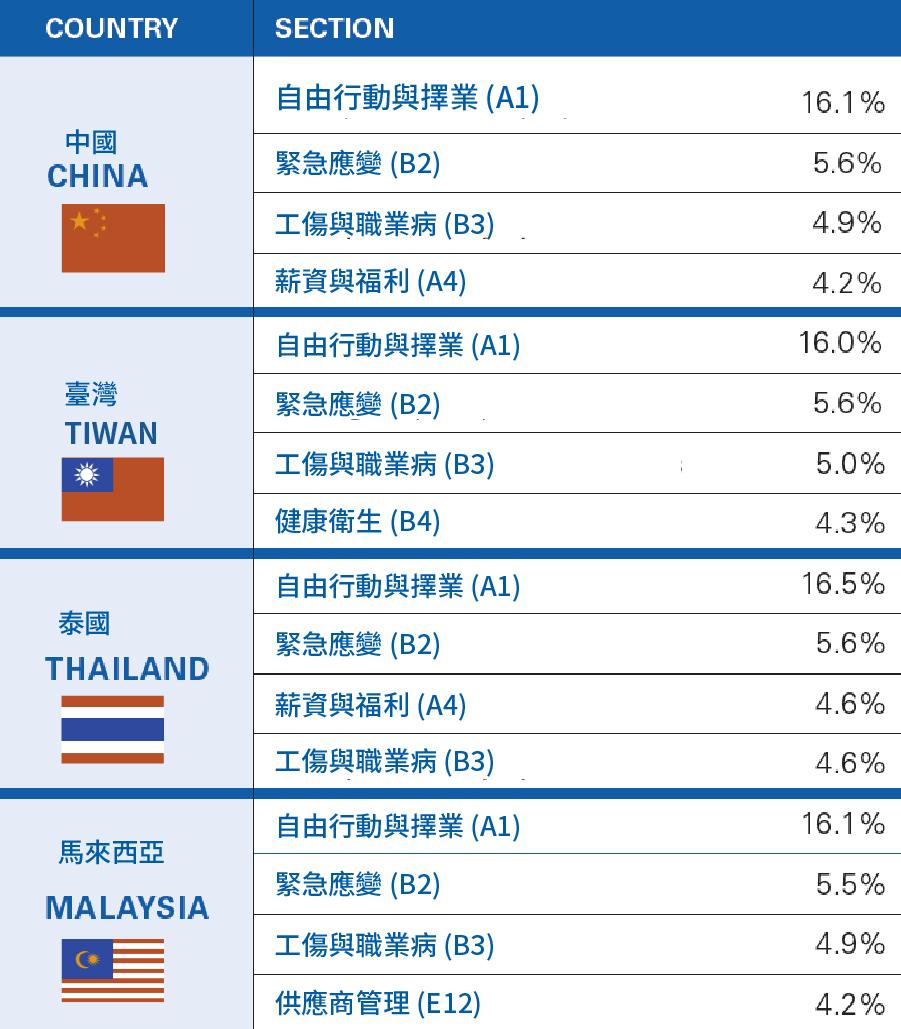 RBA VAP 前四大稽核國家分析:往下再集中 RBA VAP 前四大稽核國家 (中國、台灣、泰國、馬來西亞) 之缺失 TOP4,趨勢都普遍集中於自由行動與擇業 (A1)、緊急應變 (B2)、工傷與職業病 (B4)、薪資與福利 (A4),反而這四國在工時上的表現較於其他國家相對良好。
