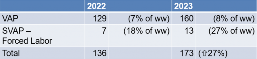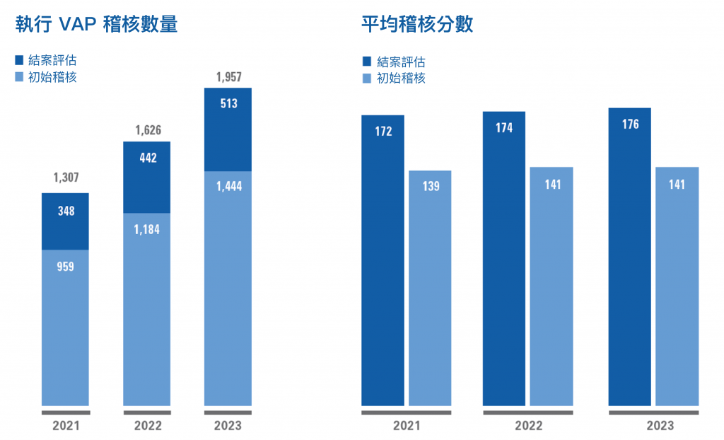 2023年台灣企業接受RBA VAP稽核共160場次,SVAP共13場次。