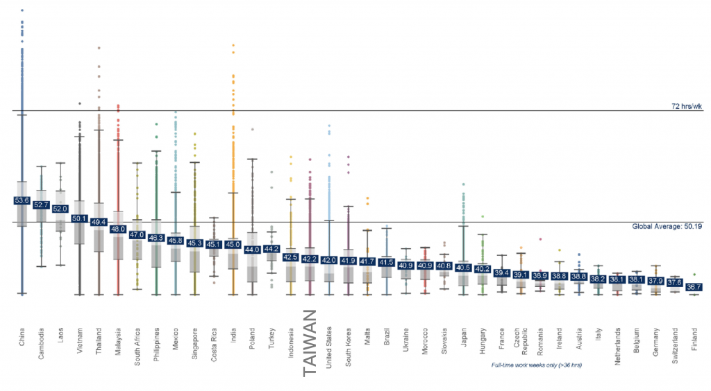 2023 年全球工時排行,前三名為中國、柬埔寨、寮國,台灣排第16、芬蘭全球工時最低。