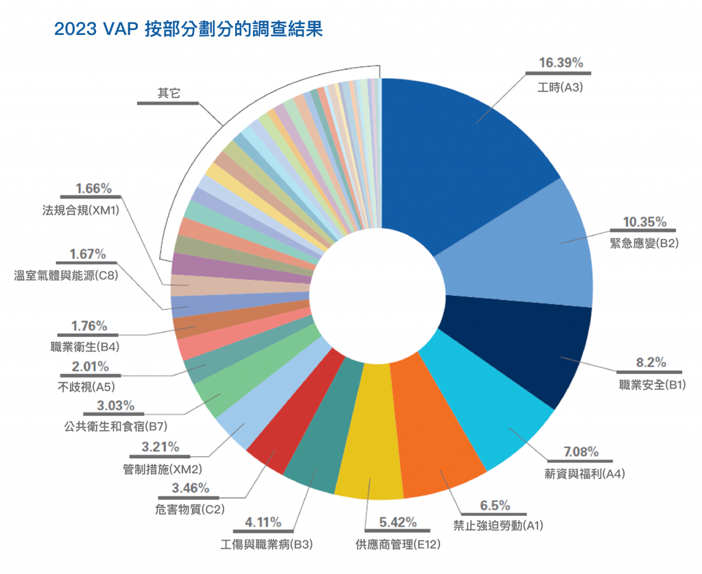 2023 年度 RBA 稽核缺失第一名與 2022、2021 年相同,仍是工時 (A3*) (註2),其次依序為:緊急應變(B2)、職業安全(B1)、薪資與福利(A4)、禁止強迫勞動(A1)、供應商管理(E4)、工傷與職業病(B3)、危害物質(C2)、管制措施(XM2)、公共衛生和食宿(B7)、不歧視(A5)、職業衛生(B4)、溫室氣體與能源(C8)、法規合規(XM1)。點我看社會責任驗廠常見缺失