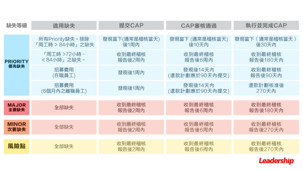 註:以上資訊僅供參考,實際仍依RBA官方最新資訊為準。如未依照上列時間表完成缺失改善之後果由最終品牌商、受稽核方、受稽核方之客戶等最終裁定。