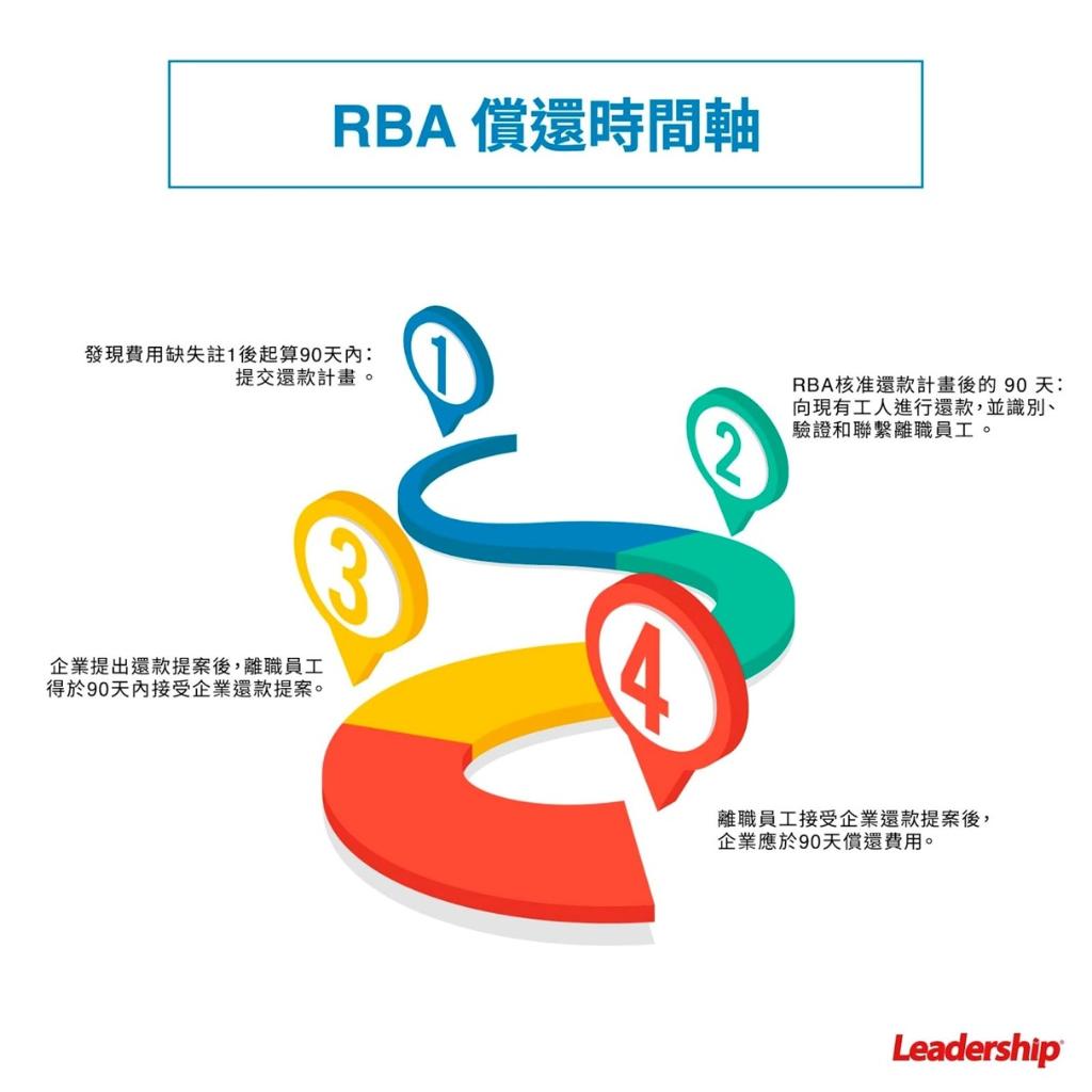 4.RBA 償還計畫要求:在發現費用缺失後的 90 天內,企業必須向 RBA 提交「費用返還還計畫reimbursment plan」,經RBA核准後。