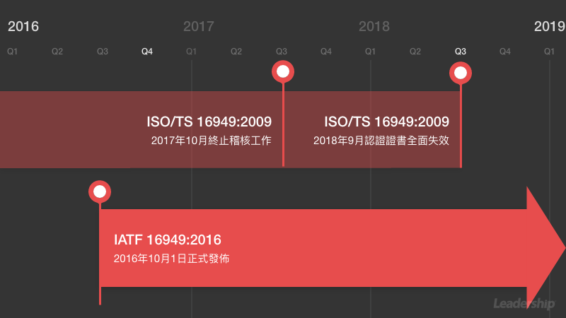 領導力企管特別提醒目前擁有  ISO/TS 16949:2009 證書的企業,它有別於其他 ISO 證書的3年轉換期,ISO/TS 16949:2009在2017年10月就已正式終止受理各項稽核工作,包括初次稽核、監督稽核、再驗證稽核或機構移轉。並且,2018年09月14日那天起,ISO/TS 16949:2009 證書就失效。我們獨家繪製流程圖解 IATF 16949:2016 ,協助您掌握改版時程。
