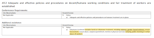 A5.1、A5.2將人道待遇的管制要求範圍擴增為「暴力、性別暴力、性騷擾、性虐待、體罰、精神或肉體脅迫、欺凌、公眾羞辱或口頭虐待工人」。