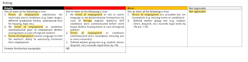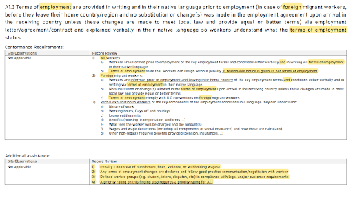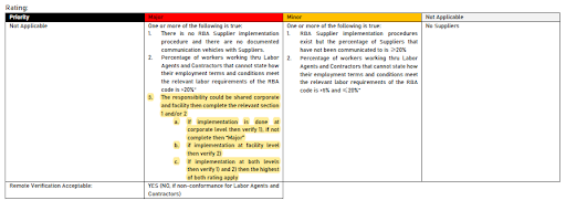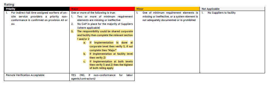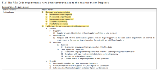 E12.2於「合規要求」的「紀錄審查」中列出「公司(corporate)層級的實施」和「設施(facility)層級(如果組織層級未實施時)」等管制規定,並可酌情審查與現場服務提供商工人的「A3工作時間」和「A4工資與福利」兩個章節所提及的相關記錄;「評級(缺失判定標準)」延續新增管制條例,進行說明。