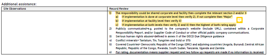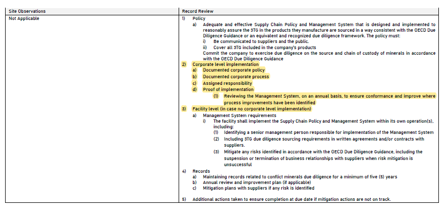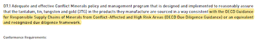 D7.1將衝突礦產的管制區域和引用標準,延伸至OECD(經濟合作組織)所界定的區域和其所制定的開發與發展指南;「合規要求」的「紀錄審查」中也要求,相關政策必須「公開傳達、傳達給供應商」,並同步列出「公司(corporate)層級的實施」和「設施(facility)層級(如果組織層級未實施時)」等管制規定;「其他判定輔助」中的第一項針對公司層級和設施層級的說明,應該是放錯位置,建議可將其視為「評級(缺失判定標準)」的說明。