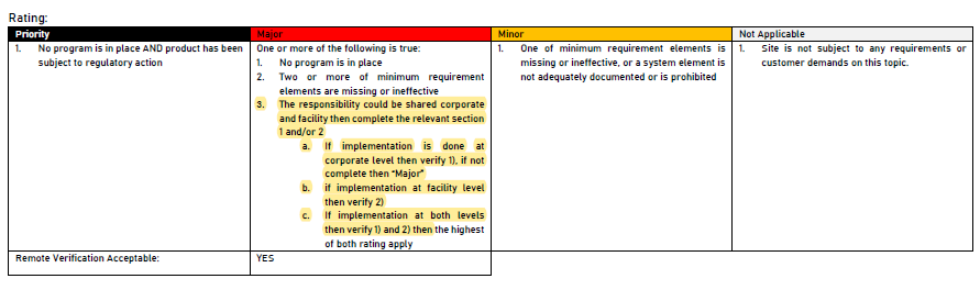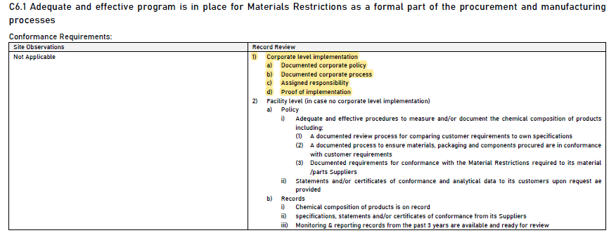 C6.1針對禁限用物質的管制,於「合規要求」的「紀錄審查」中列出「公司(corporate)層級的實施」和「設施(facility)層級(如果組織層級未實施時)」等管制規定;「評級(缺失判定標準)」延續新增管制條例,進行說明。