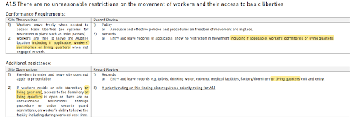 A1.5在「合規要求」和「其他判定輔助」都將「工人宿舍或住所」納入應確保工人可自由行動的範圍中。