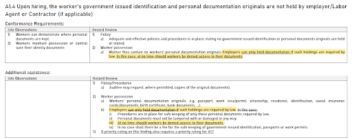 A1.4「合規要求」的「紀錄審查」-「2)工人所有權」中強調「雇主只有在法律有此要求時才能持有工人護照或相關證件。同時,雇主亦對不能拒絕工人取用護照或相關證件。」;「其他判定輔助」的「紀錄審查」部分也將原本規範「雇主必須確保員工提出需求時能夠在 12 小時內提供護照或相關證件」刪除,移除了12小時的時限要求。