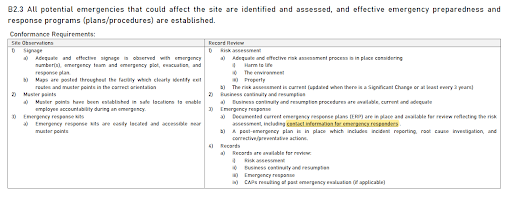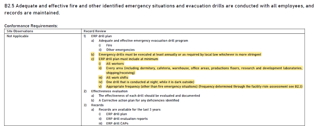 B2.5配合新版行為準則內容更動,將「緊急演習必須至少每年執行一次或按照當地法律的要求執行,以較嚴格者為準」也納入「合規要求」的「紀錄審查」中說明,並將原本放在「其他判定輔助」中的「ERP訓練計劃」要求直接調整至「合規要求」中。