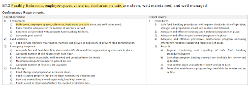 B7.3 將「乾淨且得到妥善維護和良好管理」的管制區域,從「餐廳」擴增到「浴室、員工休息區、自助餐廳、用餐區」,並同步要求這些區域都應考量與安全相關的管制規定。
