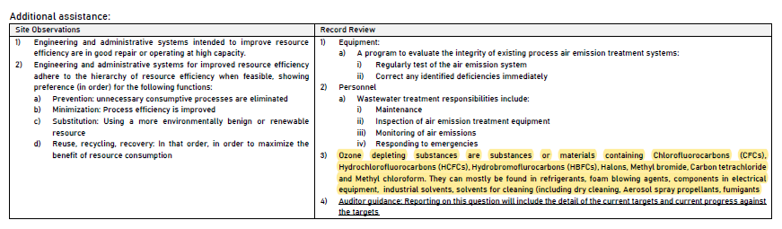 C5.1「合規要求」的「場所訪察」和「紀錄審查」中,明訂「臭氧層破壞物質應明確標示」,且「廢氣和臭氧曾破壞物質清單」應為最新、準確的版本;在「其他判定輔助」中明確定義了哪些是「臭氧層破壞物質」與其相關資訊。