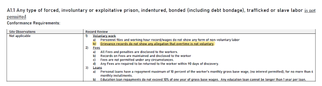 A1.1「合規要求」的「紀錄審查」-「1)自願工作」提到「申訴記錄沒有顯示任何關於加班不是自願的指控。」