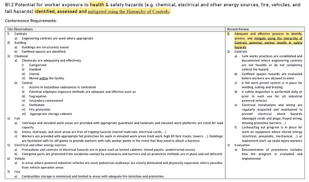 B1.2 強調應識別各種危害,並且使用並使用“危害控制層級”(包括危害消除、危害替代、工程控制、行政控制、個人防護裝備等)方式進行危害控制。這裡的危害控制層級其實在OHSAS18001、ISO45001甚至國內TOHSMS已有應用,有相關系統執行經驗者應不陌生。