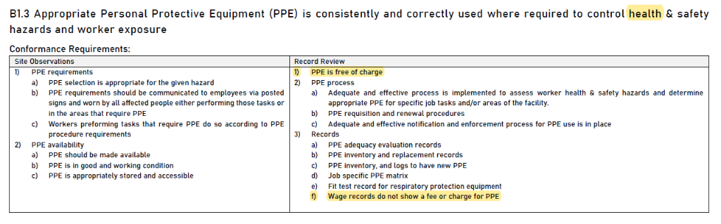 B1.3 將「健康」字眼加入,強調「健康和安全」的同等重要性,並要求「免費提供PPE(防護用具)」,紀錄審查時也「不可在工資記錄出現PPE的費用」。