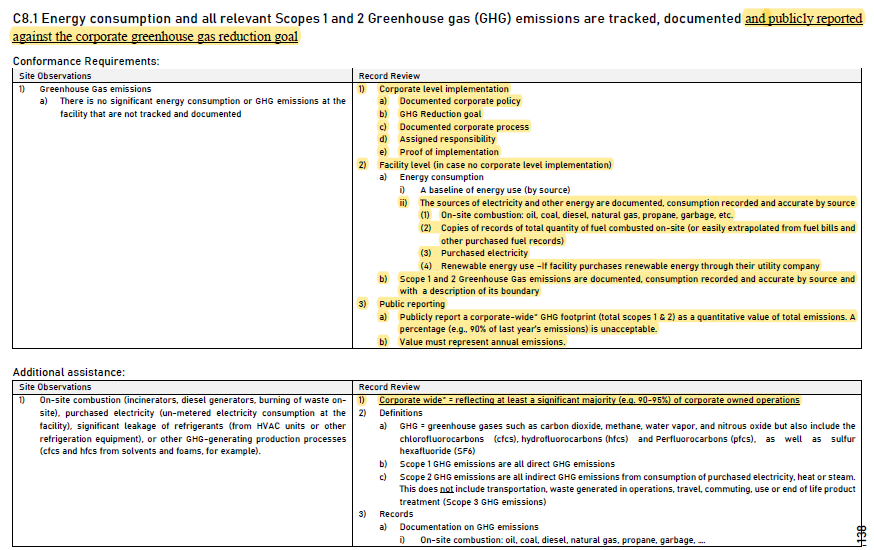 C8.1要求公司應公開「公司溫室氣體減排目標」,並須同步列出「公司(corporate)層級的實施」和「設施(facility)層級」的不同管制規定要求, 這也是本次改版的一項重大差異,這邊提到公司層級和設施層級,指的是有些公司有許多設施(生產工廠),但不一定是所有工廠都導入RBA,所以這時候就會有區分是公司層級或設施層級符合性的差異。另外還有要求:要有「書面政策」、「公開報告」的「數值」必須是年度排放量。