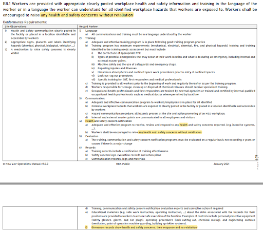 B8.1 強調應「鼓勵工人提出任何健康和安全問題,無須擔心被報復」,也就是吹哨者保護條款的衍伸,並將此管制要求納入「合規要求」的「紀錄審查」中。