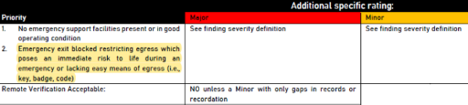 改為:「緊急出口被阻擋限制了逃生,在緊急情況下對生命構成直接風險或缺乏簡單的逃生方式(如:鑰匙、門禁卡、密碼)」。