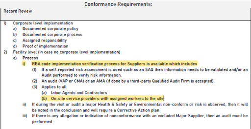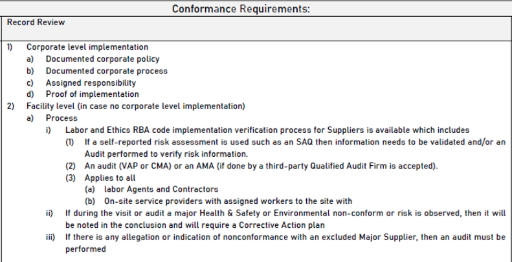 供應商稽核範圍調整,草稿版本應為誤植將「評核供應商之對於人權與商業道德之符合性」改為「評核供應商對於 RBA 準則之符合性」。