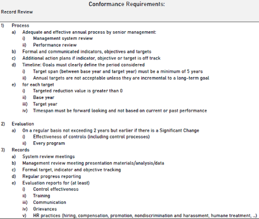 d)時間表:目標必須明確界定考慮的週期; 每個目標必須包括: i) 時間段:(在基準日期和目標日期之間)必須是具前瞻性的 ii) 基準日期:衡量目標的日期 iii) 目標日期:打算實現目標的未來日期 iv) 基線(base line):起始時測量的值 v) 目標改進值:目標的量化值(可量化數字,且數字需大於0) |