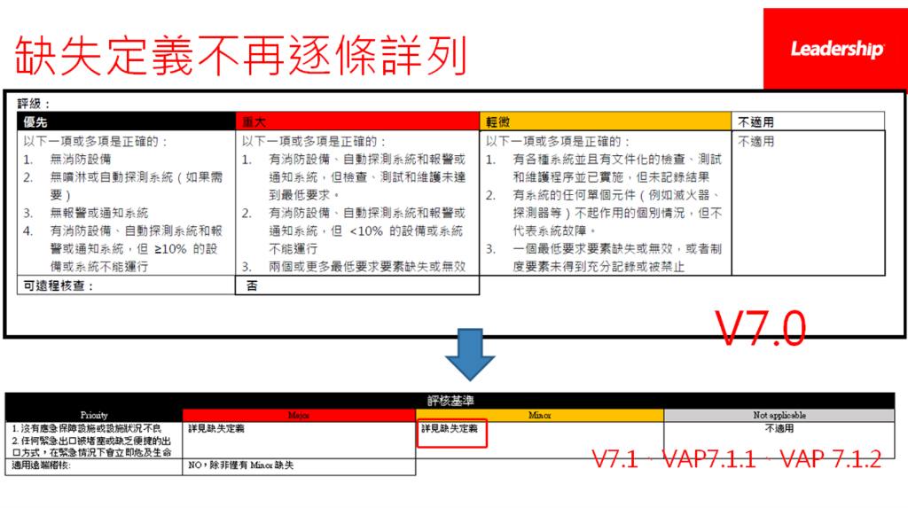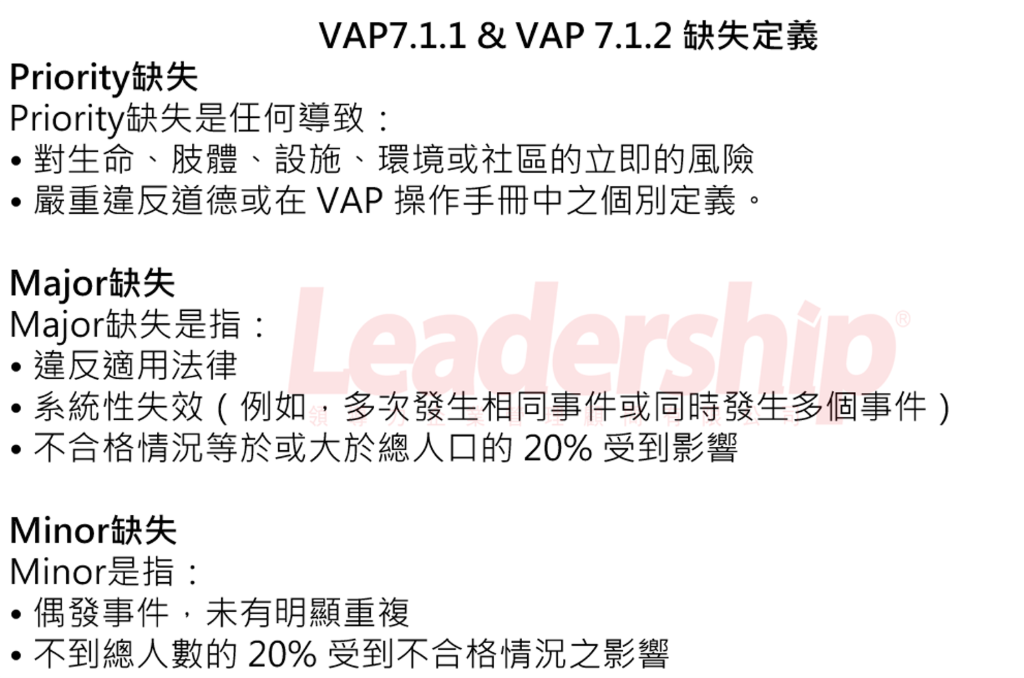 「移動」缺失定義:原本 VAP 個項目都有各自的缺失定義與判定標準,而此缺失定義在 VAP 7.0 中是個別每項逐一列出列判定標準如【圖1】,例如:缺少 1 份必要程序文件為判定 minor 缺失;累積 2 份程序文件則判定成 major 缺失,於去年(2022 年)改版至 7.1 時做了重大改變,把它化繁為簡,把每項缺失判定簡化成短短幾行字的判定標準,如【圖2】即是新版 VAP 提到的「缺失定義」。