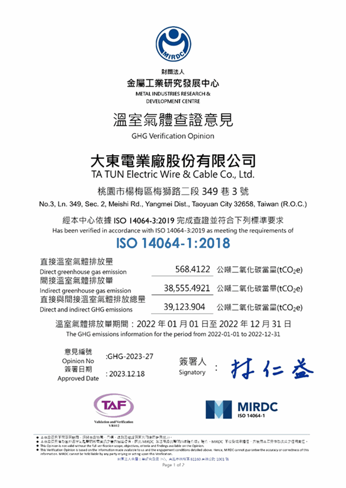 在領導力企管專業顧問輔導下,大東電業廠股份有限公司 (1441) 已順利完成 ISO 14064-1:2018(Greenhouse gases Part 1:Specification with guidance)溫室氣體盤查之教育訓練(Training)、系統建置(Implementing)、外部稽核驗證(Certification)三大實施流程,順利取得 ISO 14064-1 溫室氣體盤查認證。