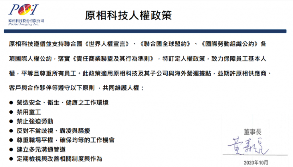 ▲ 原相科技的「社會責任政策」資料來源:原相科技官網