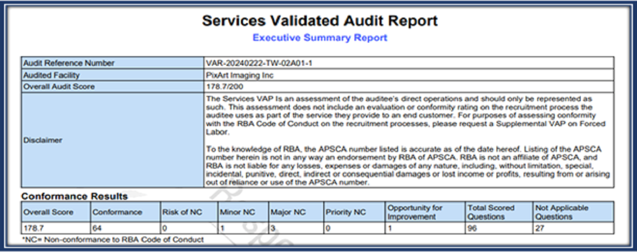 在領導力企管的專業輔導下,原相科技股份有限公司(PixArt Imaging Inc.)已完成 RBA 責任商業聯盟行為準則 7.0 版(舊稱EICC)二者稽核。 在正式稽核前,原相科技早已累積了多年的企業社會責任成果與實力,並針對 RBA 所要求的五大面向(勞工權益、健康與安全、環境、商業道德、管理系統)投注大量心力與努力。從管理制度的建立到執行,將原相科技的永續經營績效完成呈現給所有關切組織的利害關係人(原相科技 2021 ESG 報告書)。