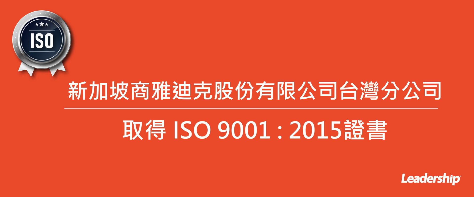 在領導力企管專業顧問的輔導下,新加坡商雅迪克股份有限公司台灣分公司已順利完成 ISO 9001:2015 系統(ISO 9001:2015 Quality Management Systems)的教育訓練、系統建置及外部稽核驗證三大實施流程,並成功取得 ISO 9001:2015 證書。