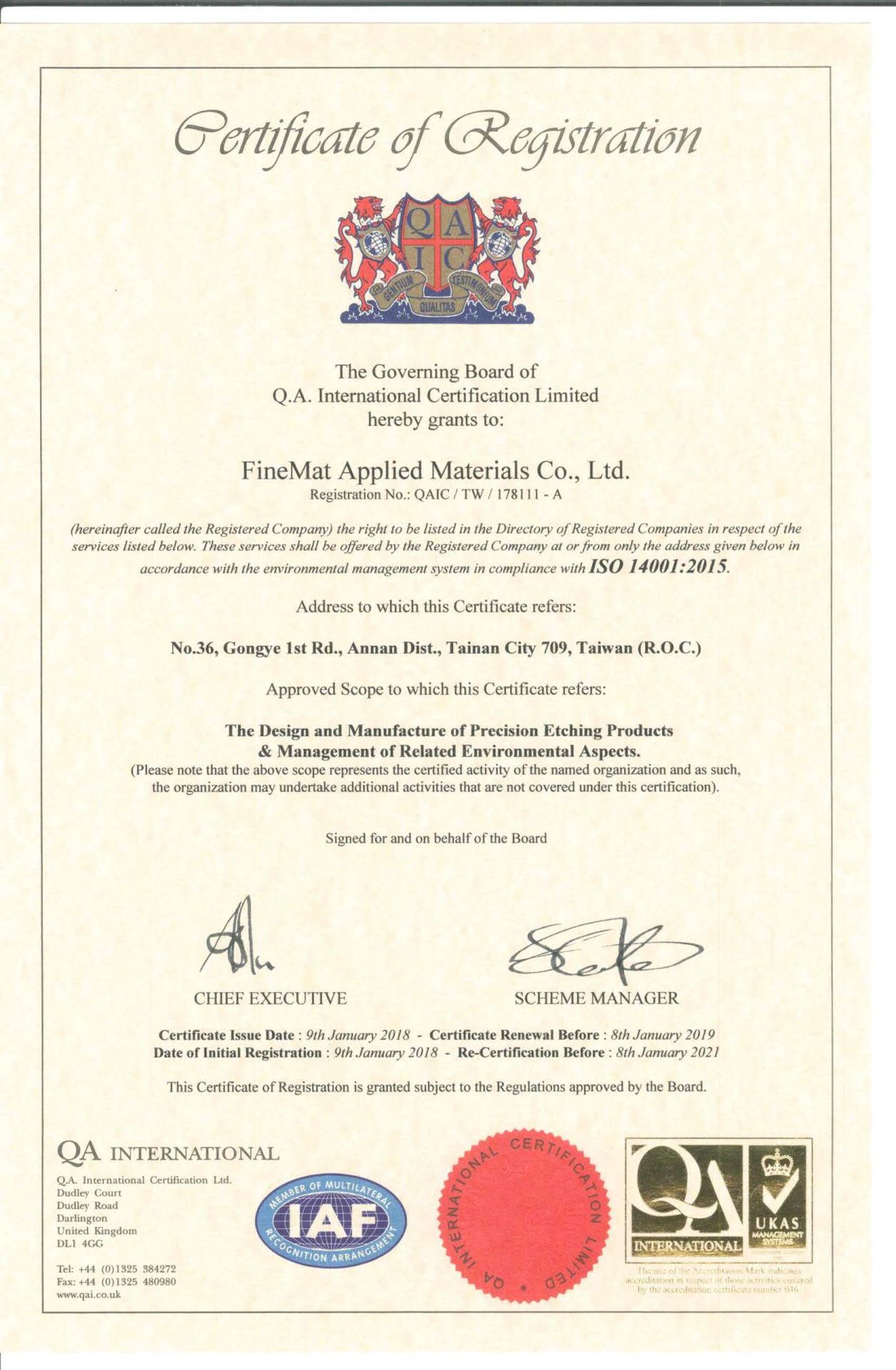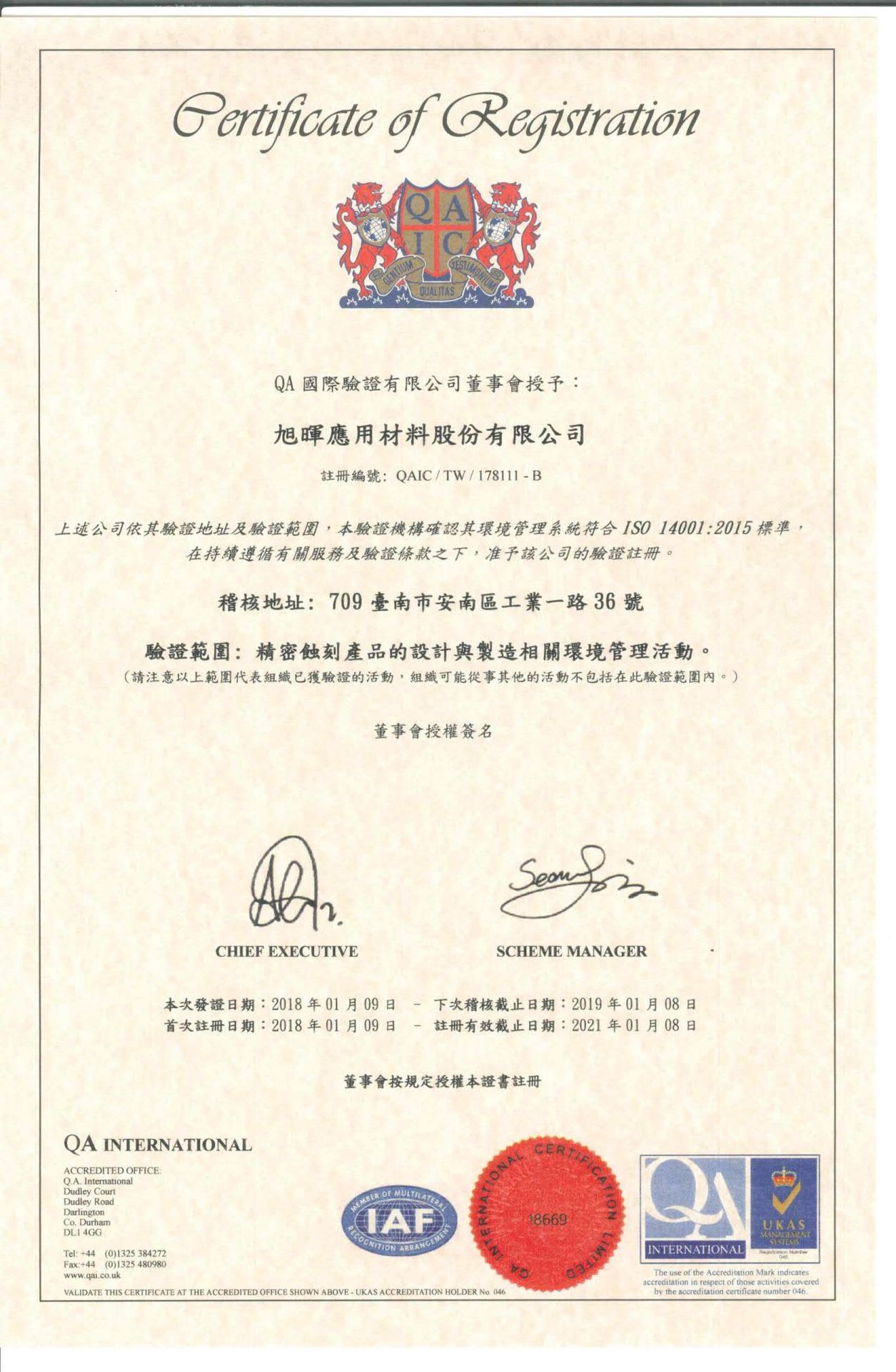 在領導力企管專業顧問輔導下,旭暉應用材料股份有限公司已順利完成 ISO 14001:2015 環境管理系統(ISO 14001:2015 Environmental management systems) 教育訓練(Training)、轉版系統建置(Implementing)、外部稽核驗證 (Certification)3大實施流程,並且榮獲 QA 頒發 ISO 14001:2015 環境管理系統新版證書。