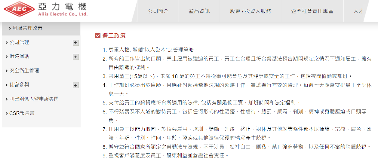 ▼亞力電機於官網公告《企業社會責任政策》