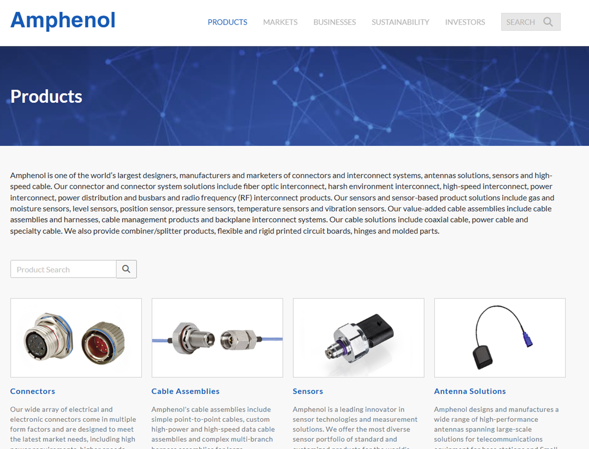 安費諾公司(Amphenol)創立於1932年,是全球領先的電子及光纖連接器、線纜及互連系統製造商。其台灣分公司於1989年正式成立,主要產品包括連接器、電纜、線束、軟性印刷電路板等。公司秉持著「提升全體顧客滿意度」與「研發創新產品」的經營理念,致力於提供優良的產品品質和完善的顧客服務,使其在競爭激烈的電子業界中保持領先地位。