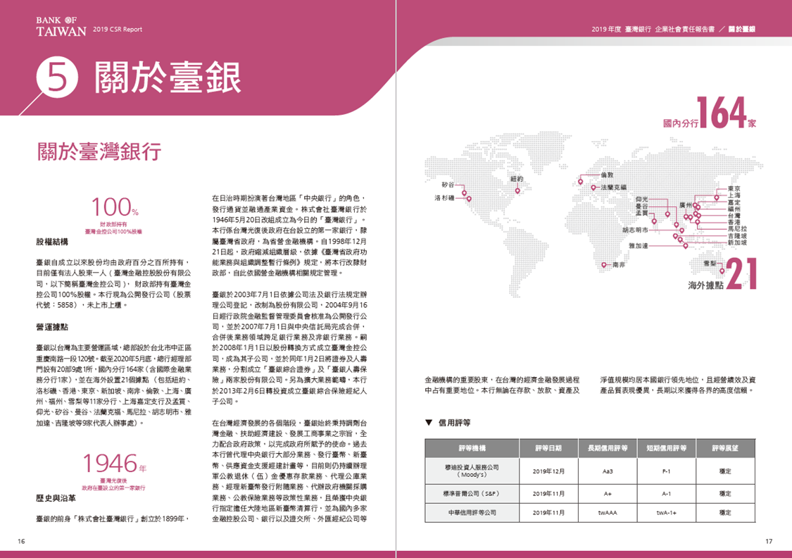 - 在公司治理面(Governance),依 2019年英國銀行家雜誌(The Banker)公布千大銀行排名,臺銀居全球銀行總資產排名第 124名,為台灣排名最佳銀行;在穆迪及標準普爾發布的信用評等穩居台灣銀行業龍頭。