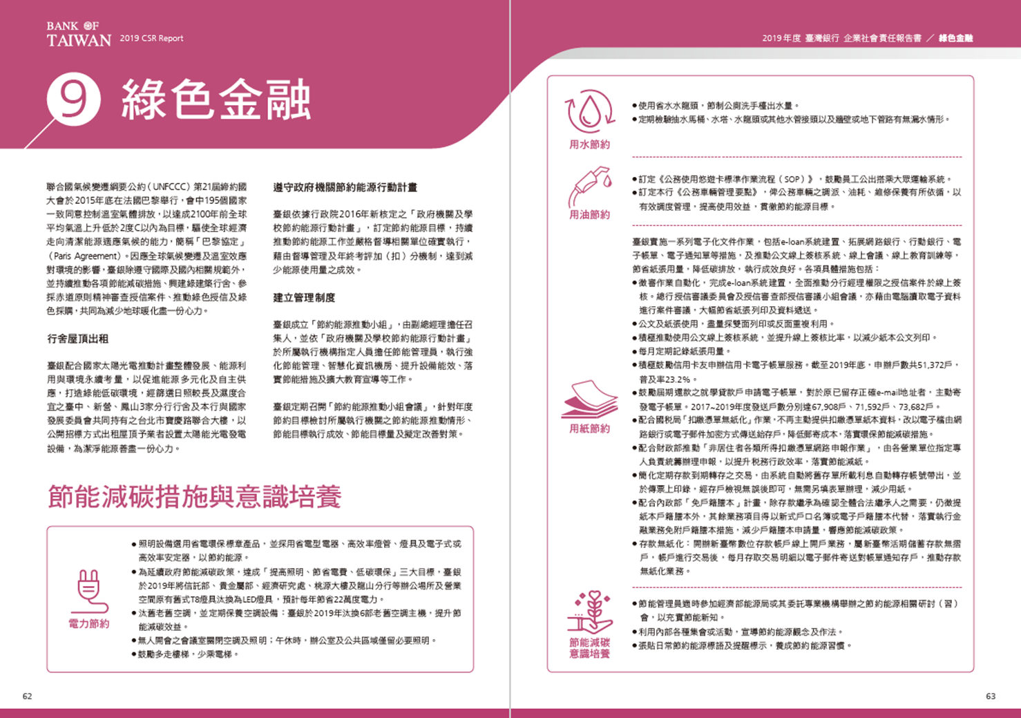臺灣銀行透過 CSR報告書之編製,在資料彙集的過程中強化跨部門的溝通能力,並將投資對象的環境、社會、公司治理面所帶來的潛在回報、風險和成本一併納入日常業務中考量,同時重視生態保護及環境治理,發揮銀行業的力量促進社會永續發展。