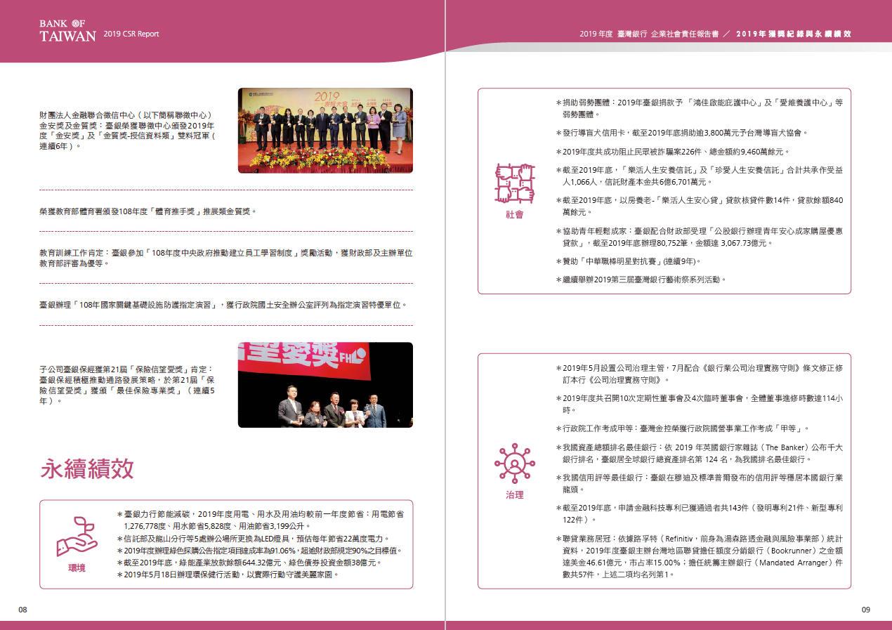 臺灣銀行此次委請領導力企管進行報告書內容校對、GRI Standards準則索引以及美編設計服務。臺銀 2019年 CSR Report資訊豐富,以清楚的時序邏輯編寫報告書、強化報告可讀性;再用插畫、icon、亮點績效圖像化區隔出訊息層級與欄位,同時為報告書增添活潑多樣性,讓臺銀的企業永續報告書具備良好溝通性(communication),並有助於利害關係人重點聚焦。