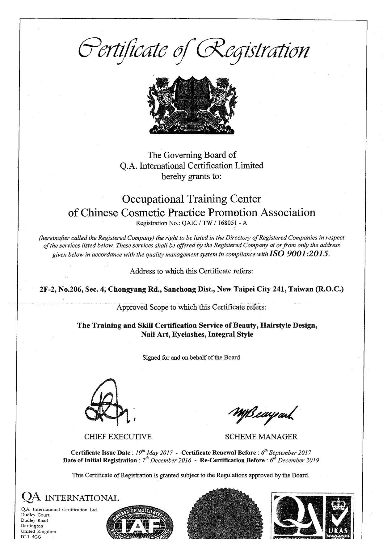 在領導力企管專業顧問輔導下,社團法人中華美容技藝促進協會附設職業訓練中心已順利完成 ISO 9001:2015 品質管理系統(ISO 9001:2015 Quality Management Systems) 教育訓練(Training)、系統建置(Implementing)、外部稽核驗證 (Certification)3大實施流程,並且榮獲QA頒發 ISO 9001:2015 品質管理系統新版證書。