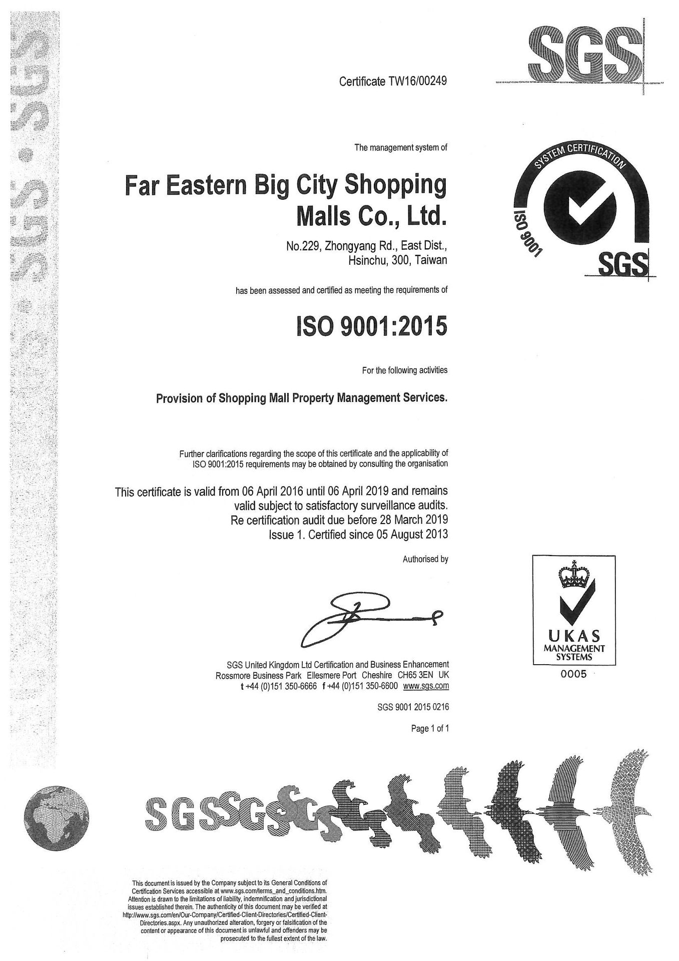 在領導力企管專業顧問輔導下,遠東巨城購物中心股份有限公司已順利完成 ISO 9001:2015 品質管理系統(ISO 9001:2015 Quality Management Systems) 教育訓練(Training)、系統建置(Implementing)、外部稽核驗證 (Certification)3大實施流程,並且榮獲 SGS 頒發 ISO 9001:2015 品質管理系統新版證書。2013年8月27日,當時的 遠東巨城以零缺失通過 SGS 台灣檢驗科技公司所核發的 ISO 9001:2008「物業管理服務」認證,成為全台灣第一家物業管理服務通過ISO認證的購物中心;今年度再次透過領導力輔導,順利完成且通過ISO9001:2015改版升級認證,以符合最新的國際標準認證。遠東巨城購物中心首店於2012年4月28日在新竹市登場,開幕至今已4年10個月,營運績效良好並已成為新竹新地標。賣場面積5萬4,000坪,汽機車停車位各達3,000個,並由國際知名設計公司concept i規劃設計。除遠東SOGO百貨公司、愛買量販店、City Super超市進駐外,威秀影城、兒童遊藝場、運動設施(包括溜冰場、直排輪,保齡球...等)、主題式餐廳、戶外休閒廣場等多項完整區域,是全家購物休閒娛樂的最佳選擇,也是國內最具規模與代表性的購物中心,期望未來透過有系統的管理制度,為民眾持續提供最佳的服務。