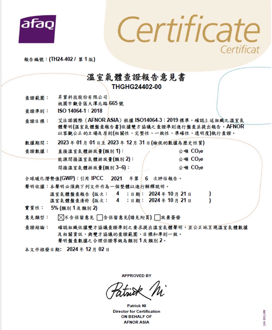 在領導力企業管理顧問有限公的專業輔導下,昇貿科技股份有限公司已順利完成 ISO 14064-1:2018ISO 14064-1:2018(Greenhouse gases Part 1:Specification with guidance)溫室氣體盤查之教育訓練(Training)、系統建置(Implementing)、外部稽核驗證(Certification)三大實施流程,順利取得 ISO 14064-1 溫室氣體盤查認證。