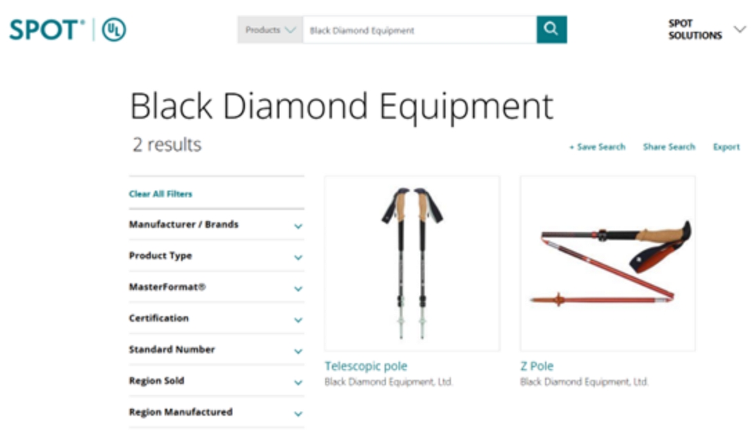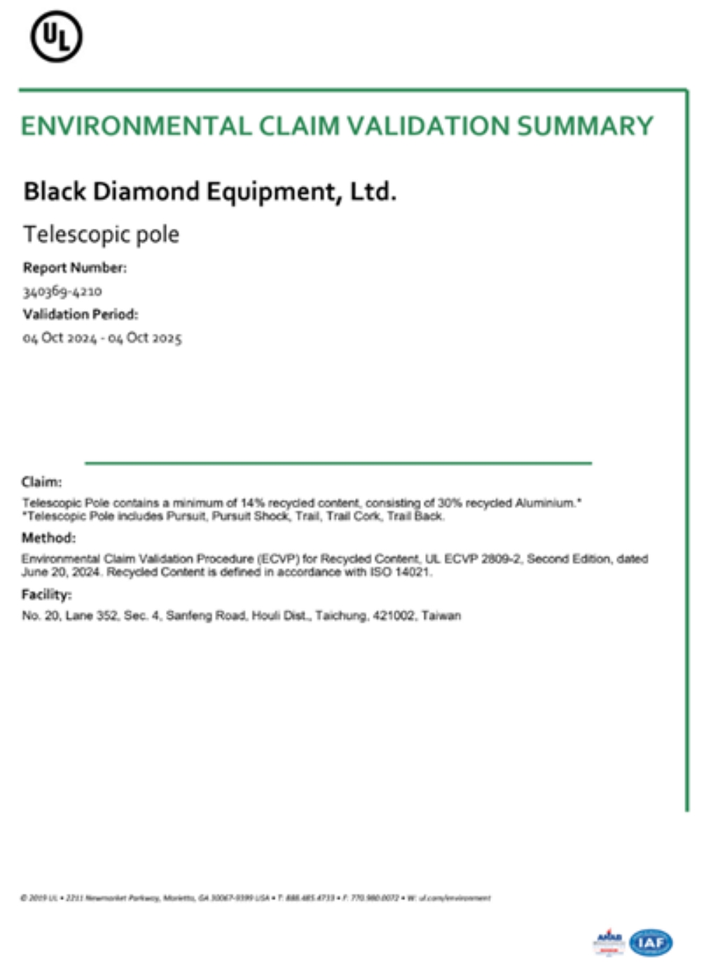 身為消費者的我們可以透過永續採購、綠色消費來支持這些商家,願意花費額外的費用來倡議環保永續,這些品牌、製造商將更樂意投入循環與永續相關投資,藉此創造良善、永續的循環。透過下列網站可查找通過UL 2809 之商品,下圖即是 Black Daimond 率先通過、使用環保再生材質製作的登山仗,UL 綠色產品查詢網址。