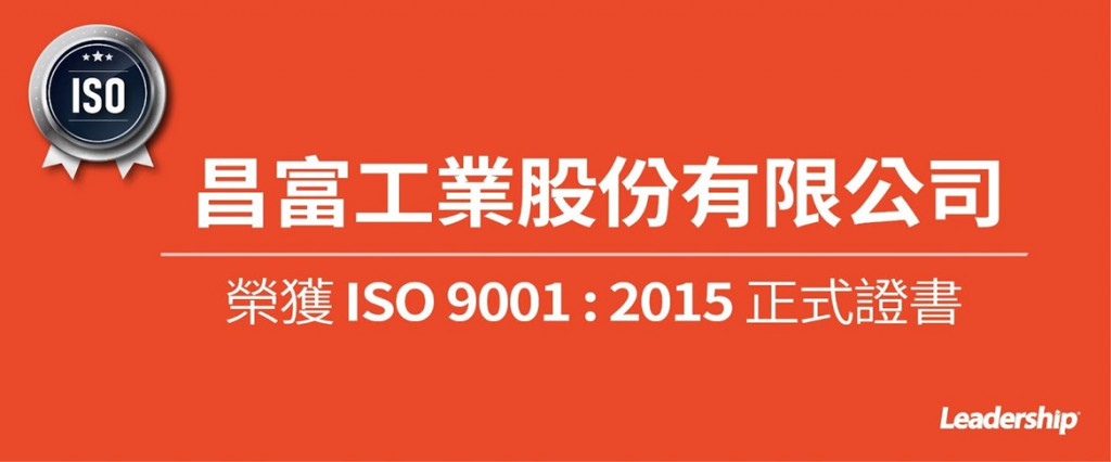 在領導力企管專業顧問輔導下,昌富工業股份有限公司 已順利完成 ISO 9001 品質管理系統(ISO 9001:2015 Quality Management Systems)的教育訓練(Training)、系統建置(Implementing)、外部稽核驗證(Certification)3大實施流程,順利取得 ISO 9001 :2015 品質管理系統證書。