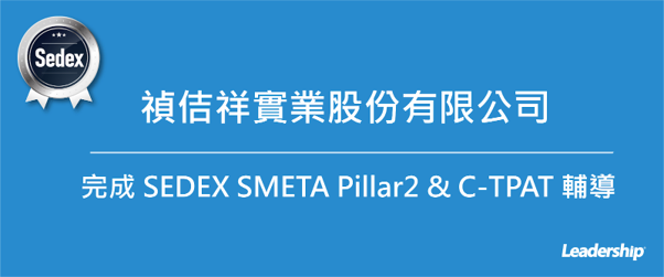 在領導力企管專業顧問輔導下,禎佶祥實業股份有限公司已順利完成3項國際認證,分別是品質管理系統(ISO 9001:2015 Quality Management Systems)、社會責任系統(SEDEX SMETA Pillar 2)、供應鏈安全系統(C-TPAT)的輔導課程。