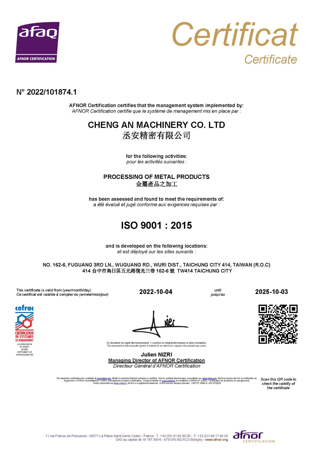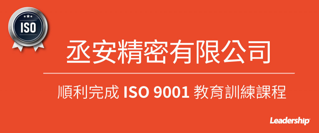 在領導力企管專業顧問輔導下,丞安精密有限公司 已順利完成 ISO 9001 :2015 系統(ISO 9001 :2015 Quality Management Systems)教育訓練(Training)、系統建置(Implementing)、外部稽核驗證 (Certification)3大實施流程,順利取得 ISO 9001 :2015 證書。