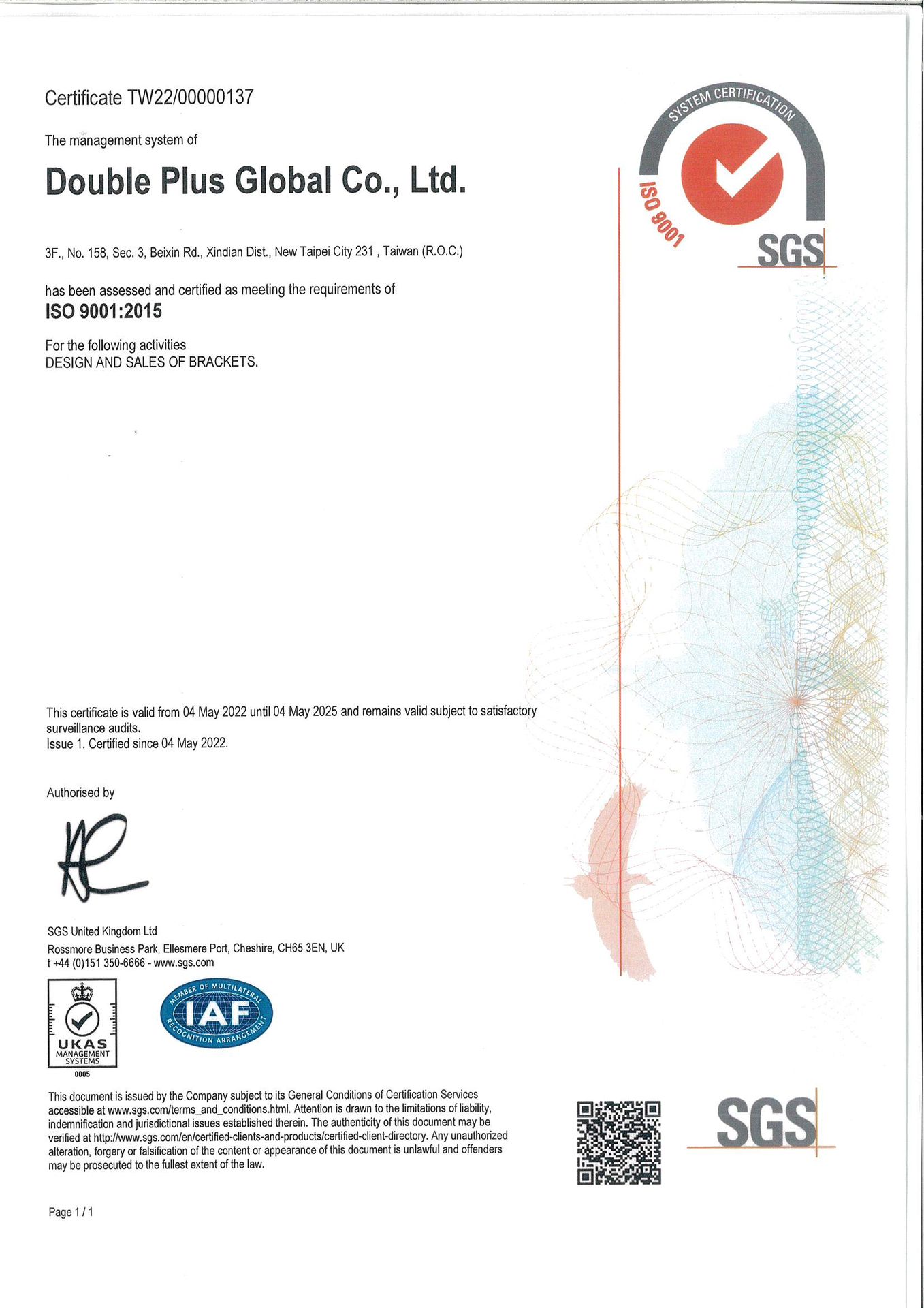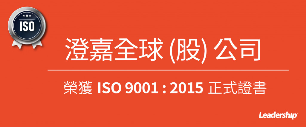 在領導力企管專業顧問輔導下,澄嘉全球股份有限公司 已順利完成 ISO 9001 :2015 系統(ISO 9001:2015 Quality Management Systems)教育訓練(Training)、系統建置(Implementing)、外部稽核驗證(Certification)3大實施流程,順利取得 ISO 9001 :2015 證書。